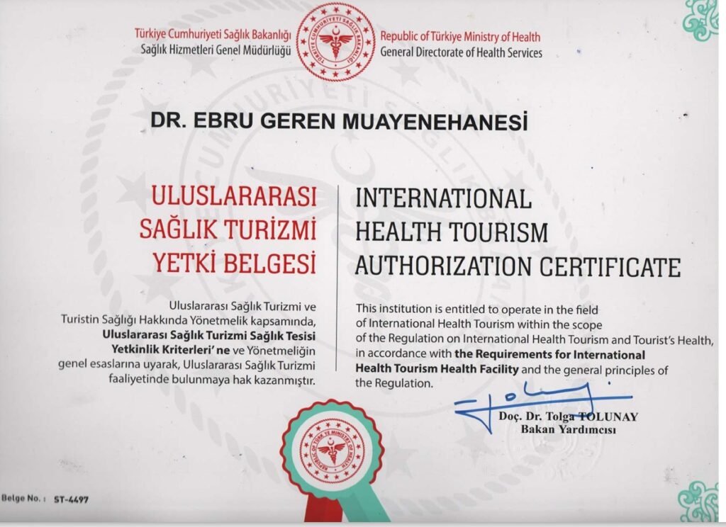 Tesisimiz, Uluslararası Sağlık Turizmi ve Turistin Sağlığı Hakkında Yönetmelik kapsamında, Uluslararası Sağlık Turizmi Sağlık Tesisi Yetkinlik Kriterleri’ne ve Yönetmeliğin genel esaslarına uyarak, Uluslararası Sağlık Turizmi faaliyetinde bulunmaya hak kazanmıştır.